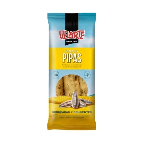 Pipas Velarte, elaboradas con semillas de girasol, harina de trigo y aceite de girasol alto oleico. Sabrosas, crujientes y perfectas para cualquier ocasión.